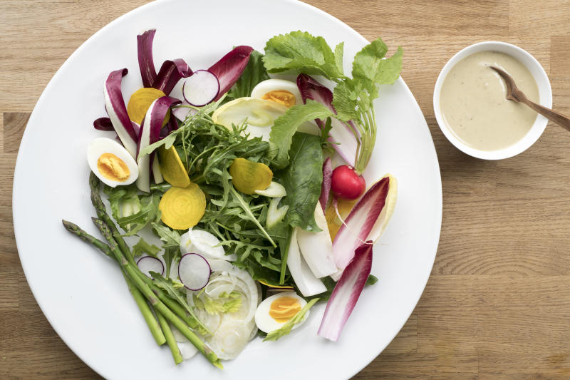 Here, it is used to dress an impromptu spring salad. Arranged on a large platter, colorful spring vegetables make a glorious display. So while you could toss the salad, simply drizzling with bagna cauda is a better choice.