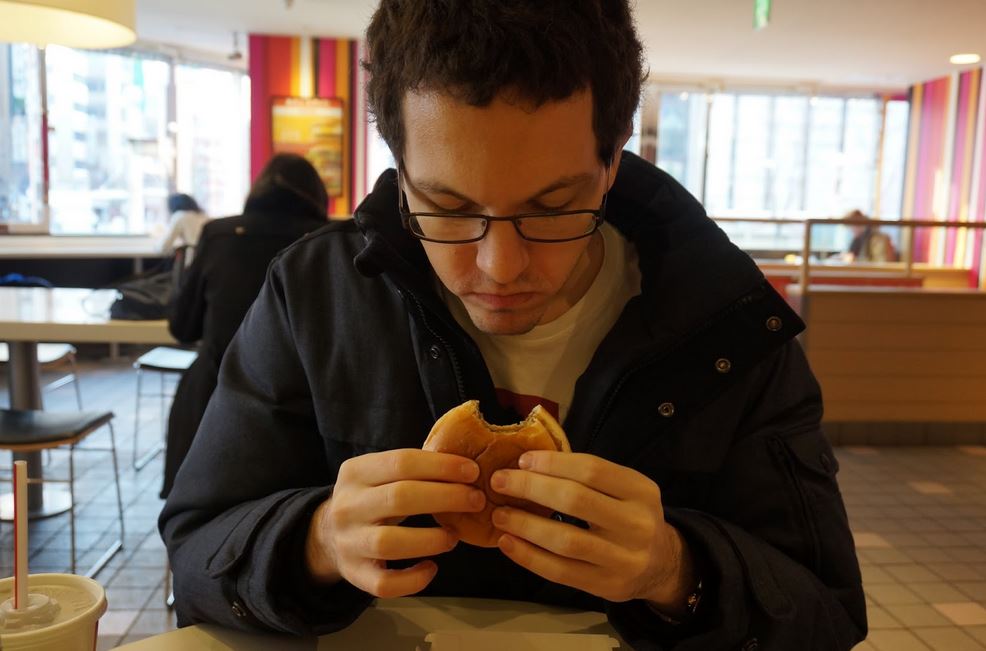 Mr James McGowan trying out the Hokkaido burger in Sapporo, Japan.