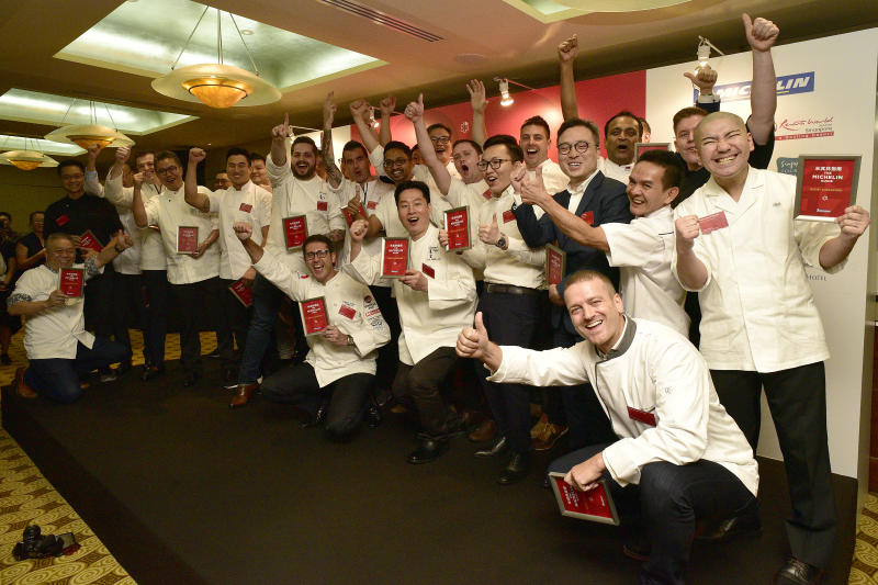 Chefs and representatives of the restaurants that received a Michelin star during the launch of the second edition of the Michelin Guide Singapore at Fullerton Hotel on June 29, 2017.