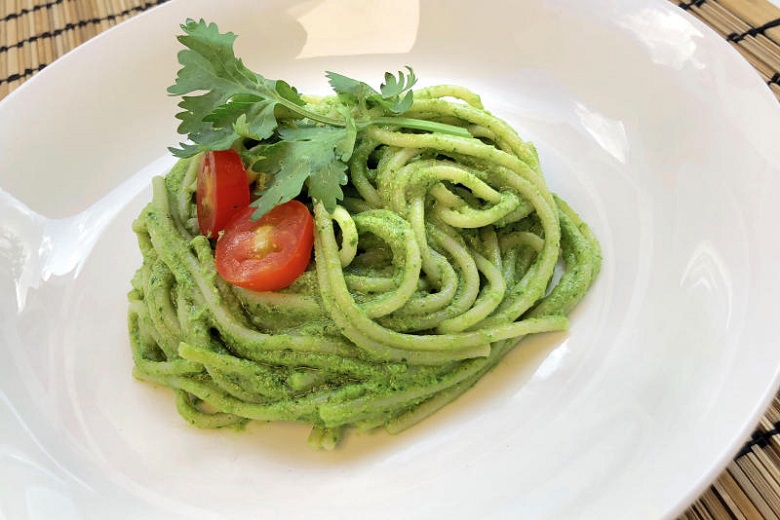 Brown rice pasta with coriander chilli macadamia pesto