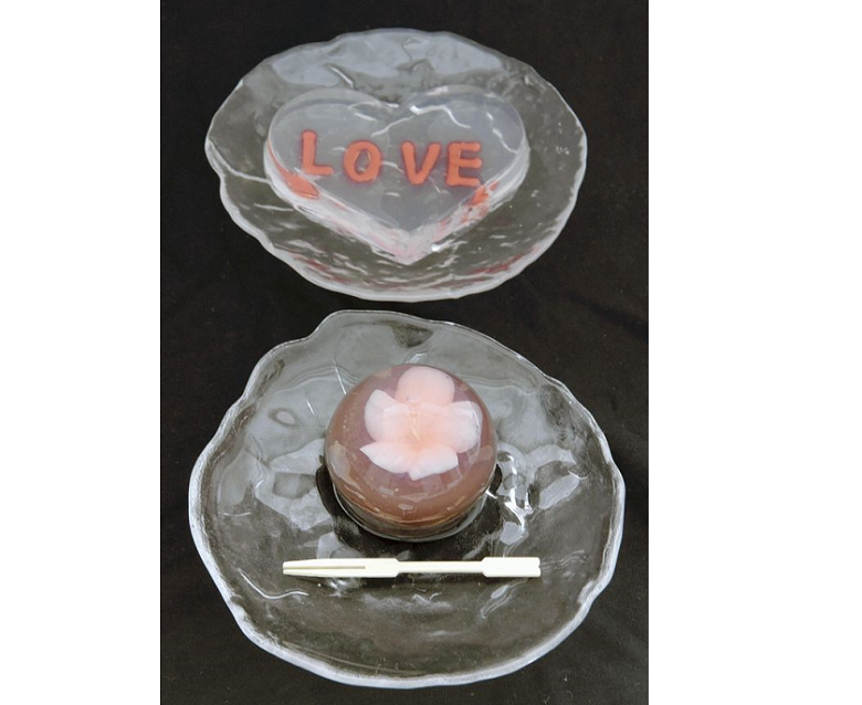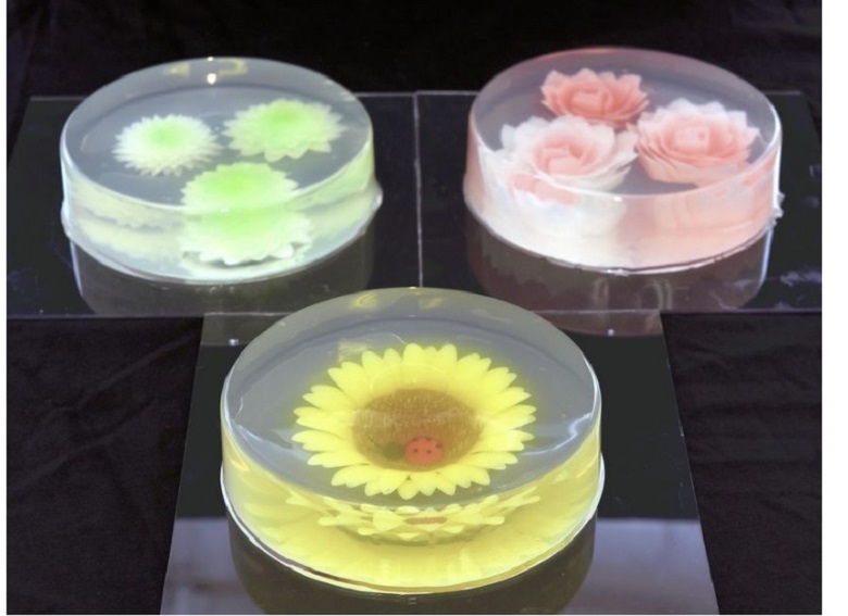 You may think they are elaborate ornaments with vividly coloured flowers inside a transparent piece of glass or plastic. But both the flowers and the "containers" are actually jelly - a new type of dessert dubbed a "flower jelly" in Japan.
