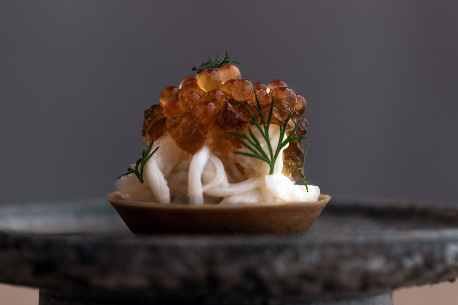 Beer poached crustacean, dill smetana, wild trout roe, fennel flowers from Restaurant Zén.