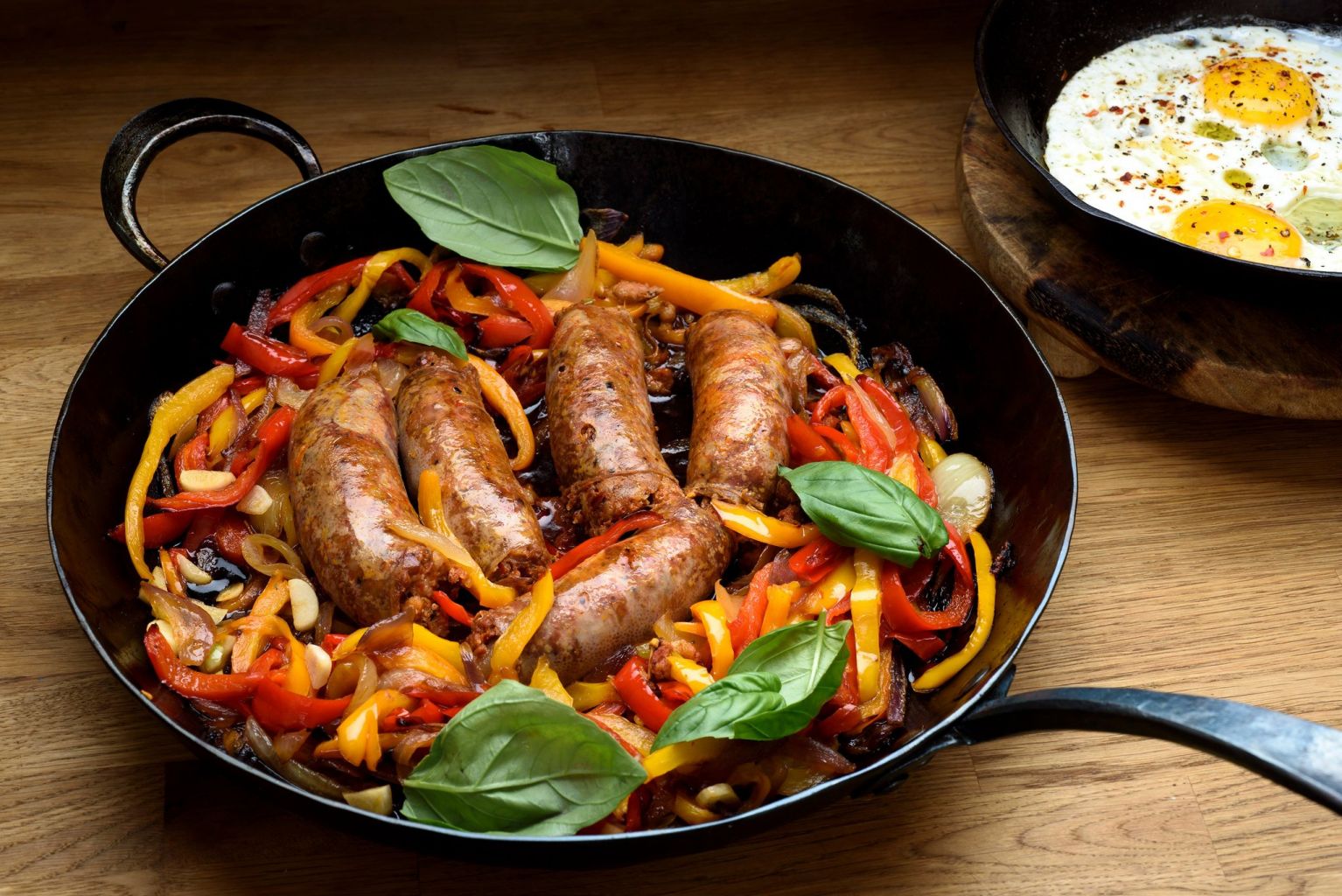 Italian pork sausages, cooked with onions and bell peppers, are big on flavour and ready in half an hour.