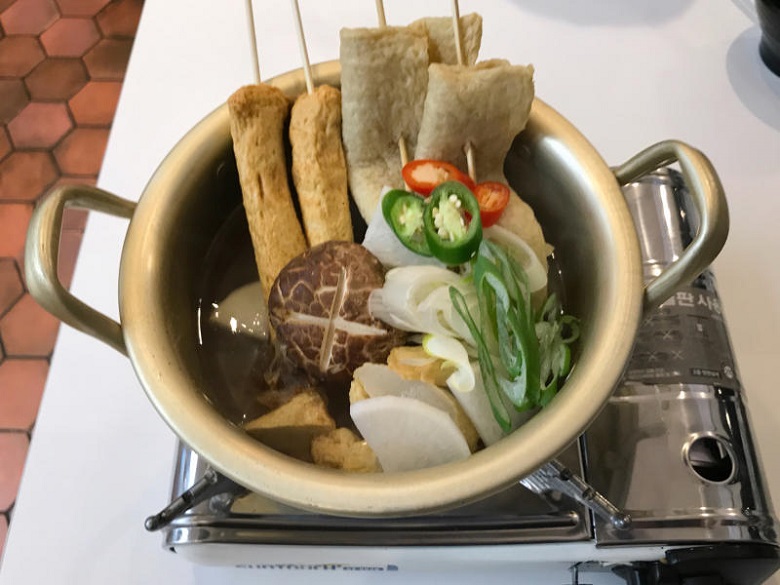 It is an umami pot of bonito broth with skewers, served like it is on the streets of Seoul. I am especially fond of the fish cakes and beancurd skin.