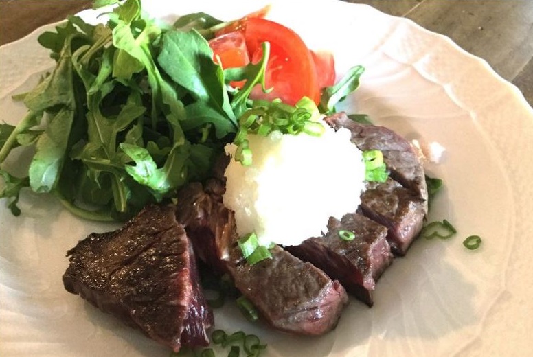 Japanese-style steak with grated daikon and citrus sauce.