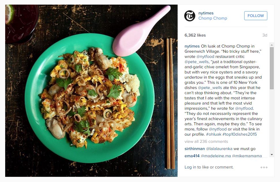 An Instagram post from The New York Times showing the oyster omelette dish from Chomp Chomp.
