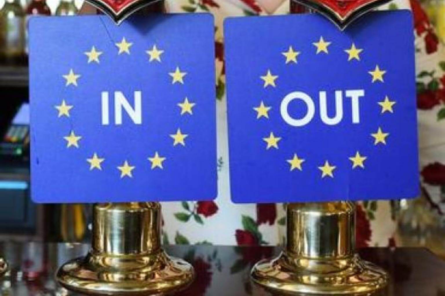 EU IN OUT bar coasters are pinned to ale taps at a pub in Westminster, London, Britain on April 15, 2016.