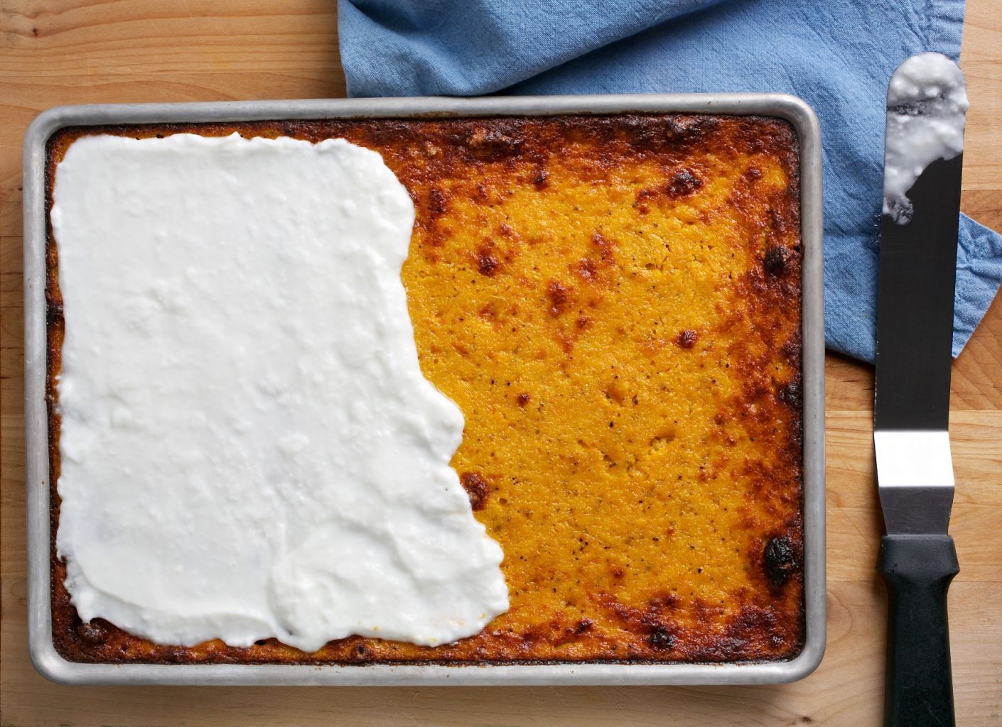 7. For the topping: Use an offset spatula to gently spread the yogurt over the pie, from corner to corner. Sprinkle the sesame seeds generously across the surface.