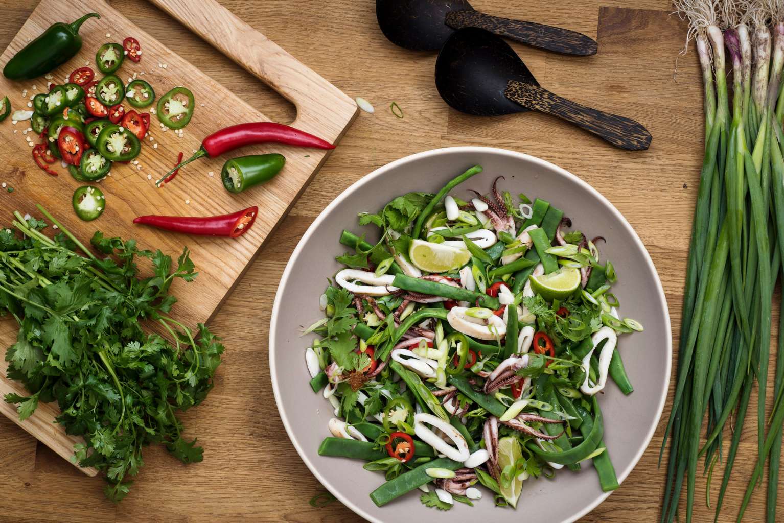 A spicy salad with grilled squid and fresh green beans is perfect for sultry weather, and a delicious alternative for preparing squid.
