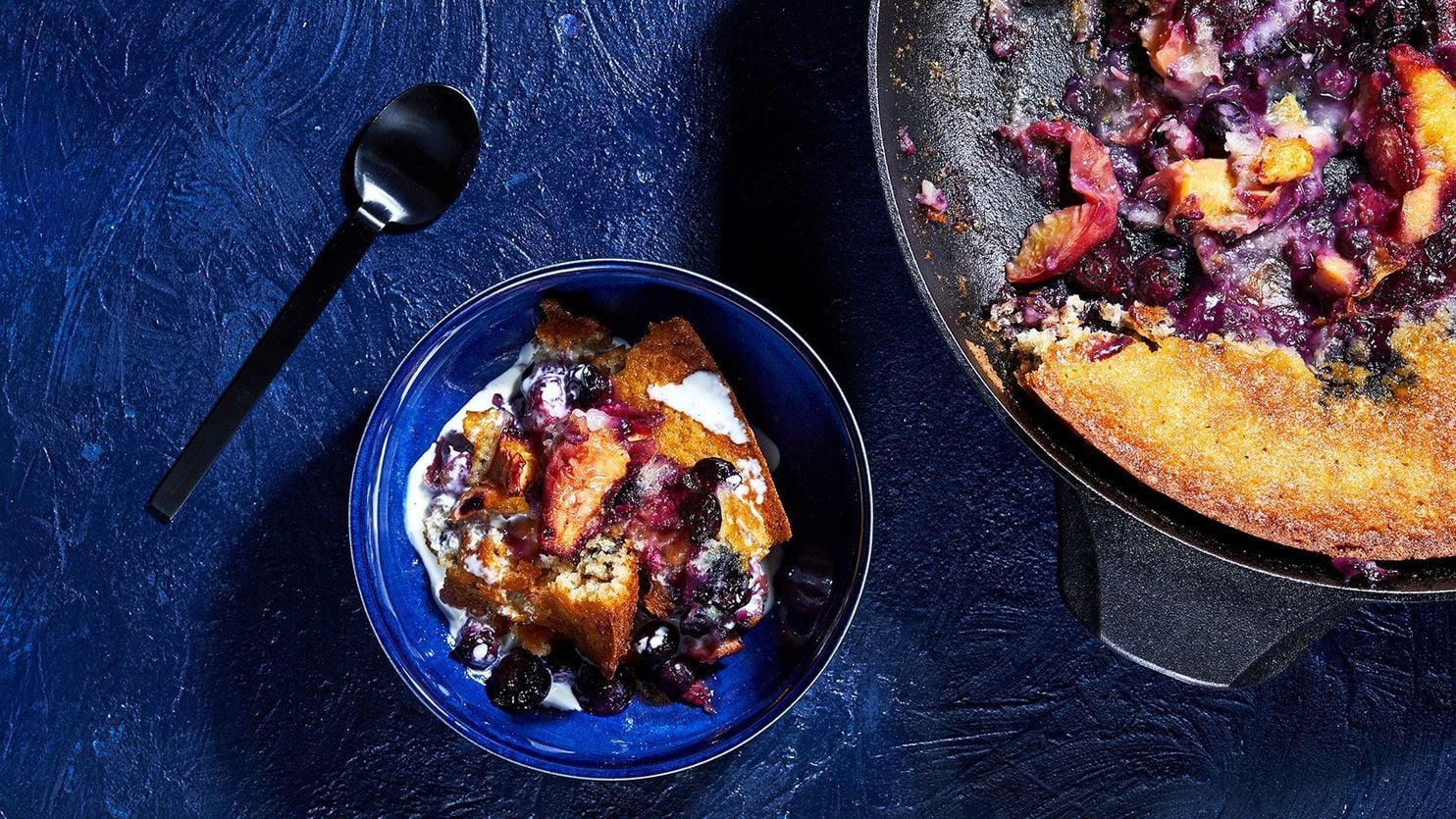 5. Remove the skillet from the oven. Carefully pour the melted butter from the skillet into the batter, stirring to combine, then pour the batter all at once into the skillet (it should begin to puff and set around the edges). Add the fruit and its juices to the centre of the batter.