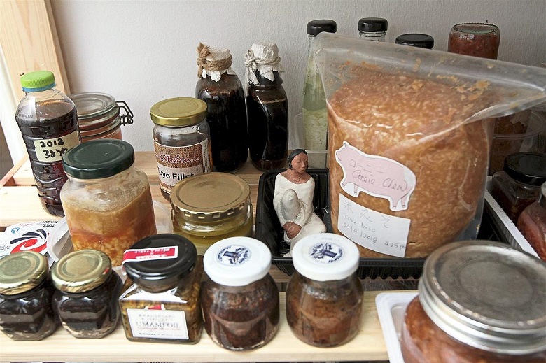 A visit to the equally tiny storage area behind her kitchen reveals shelves lined with more fermented food.