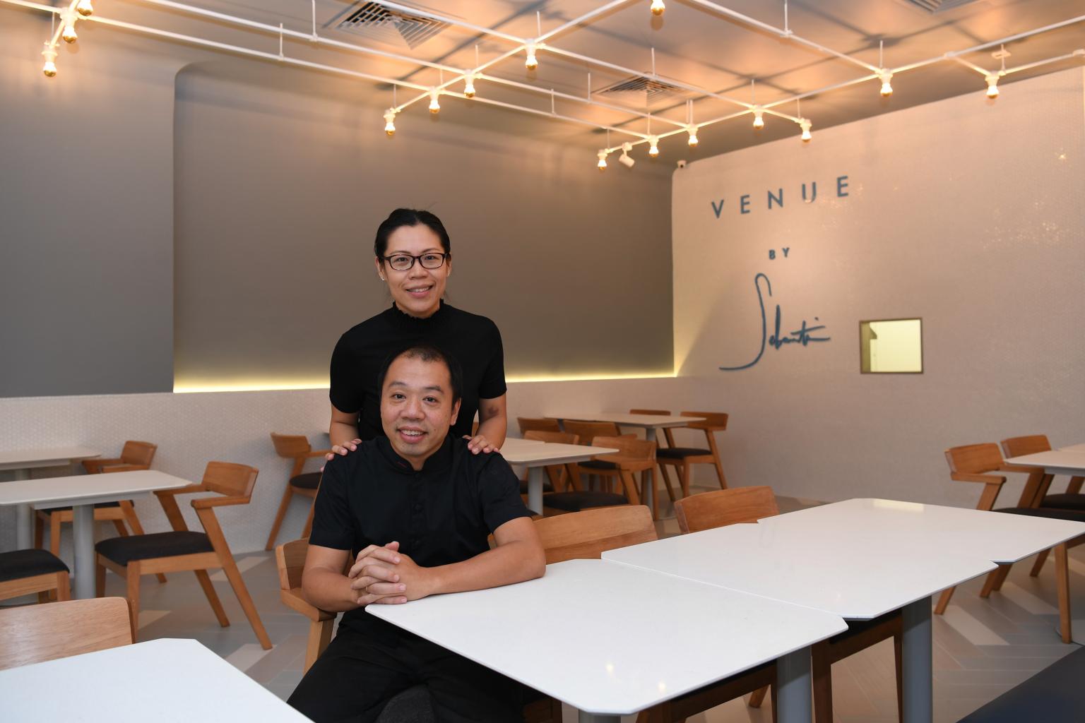 Chef Sebastian Ng and his wife Sabrina at their casual restaurant, Venue by Sebastian, at OUE Downtown complex’s Downtown Gallery mall in Shenton Way.