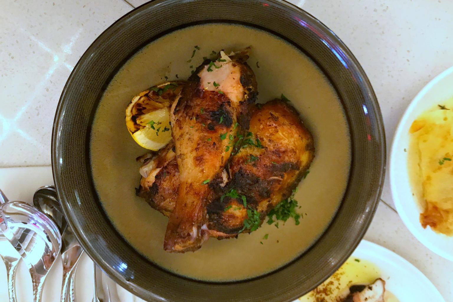 The chicken is marinated for two days in a house-made chermoula (commonly made with cumin, coriander and garlic) and slow-grilled over wood fire, resulting in tender, aromatic chicken.
