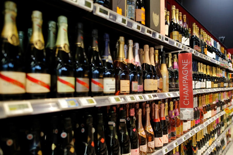 Bottles of Champagne in a supermarket in Vertou, near Nantes, France.