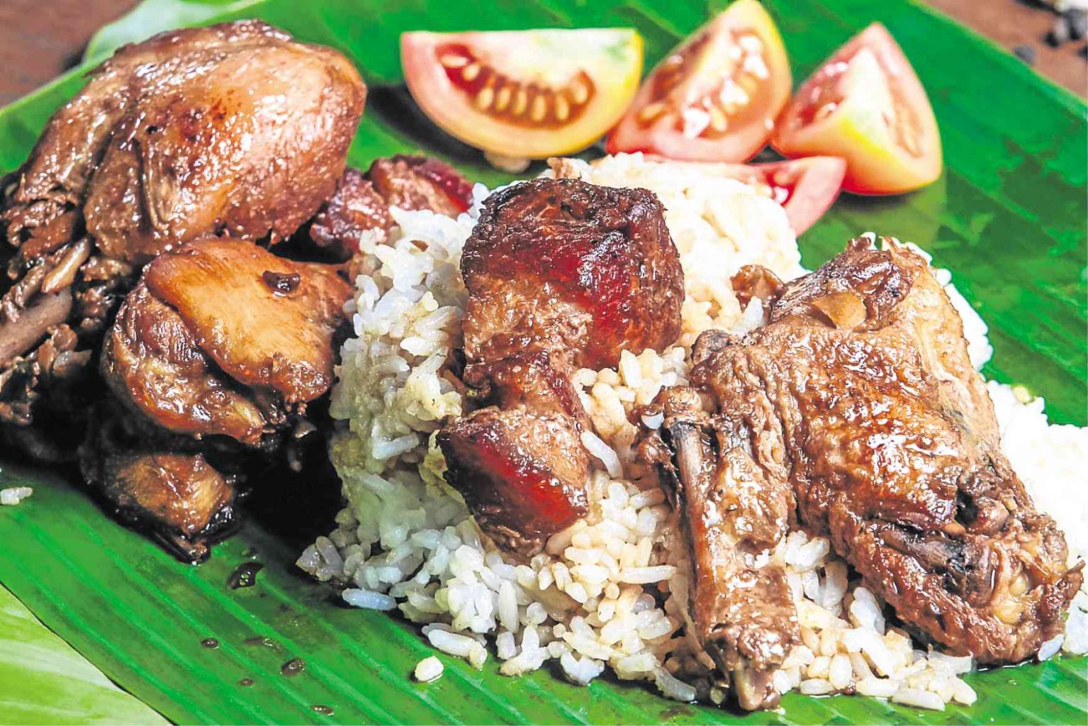 Chicken and pork adobo served with tomatoes in banana leaf. -Photos by