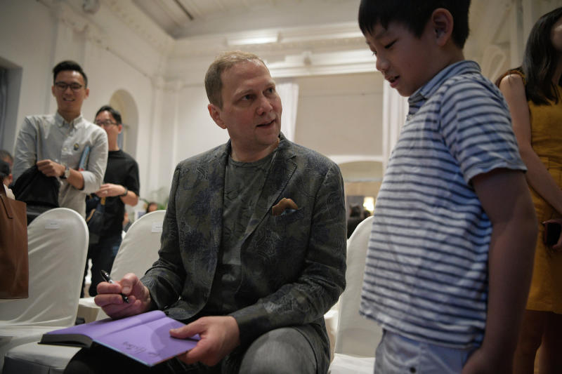 Children's author Dav Pilkey signs a book for eight-year-old Tan Hsing Chih at The Arts House on Nov 18, 2019.
