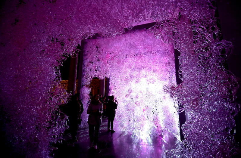 People visit an airborne labyrinth of polycarbonate installation called Limbo, created by Jacopo Foggini, during Design Week in Milan, on April 17, 2018.