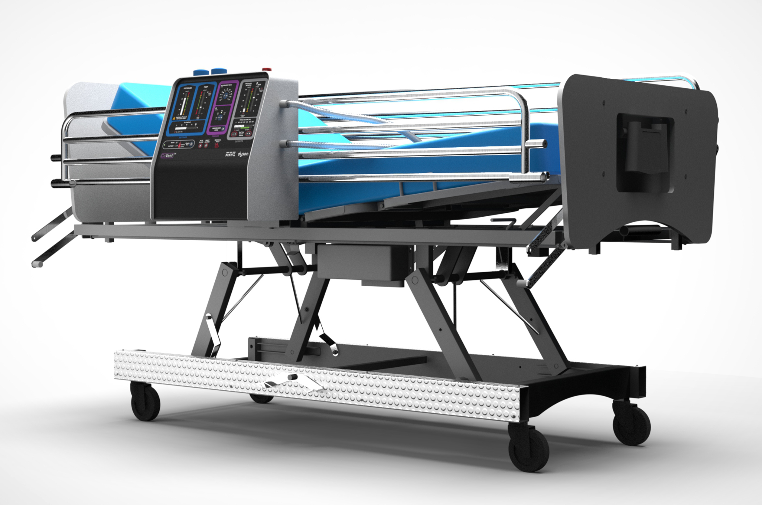 A graphic representation of the CoVent ventilator attached to a hospital bed, designed by Dyson.