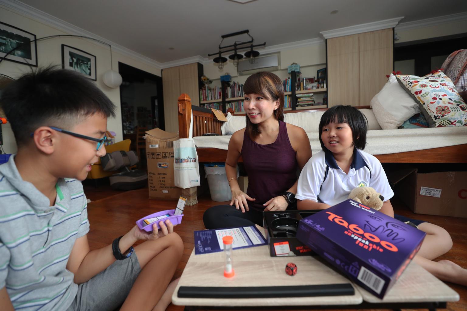 Ms Yvonne Kong-Ho (middle) joins her children, Gabriel and Natalie, for a game of Taboo.