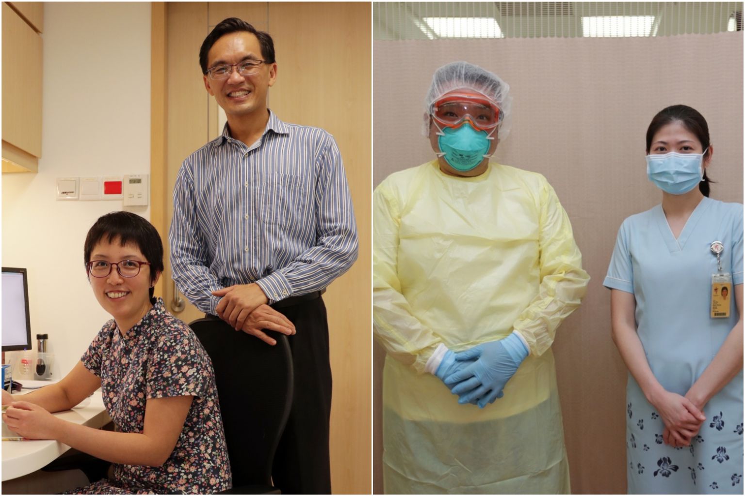 Dr Koh Li Wearn (left) and her husband Dr Ho Eu Chin, and Mr Christopher Soh (second from right), assistant director of nursing in the emergency department of Tan Tock Seng Hospital, and his wife Ms Tina See, a fellow nurse.