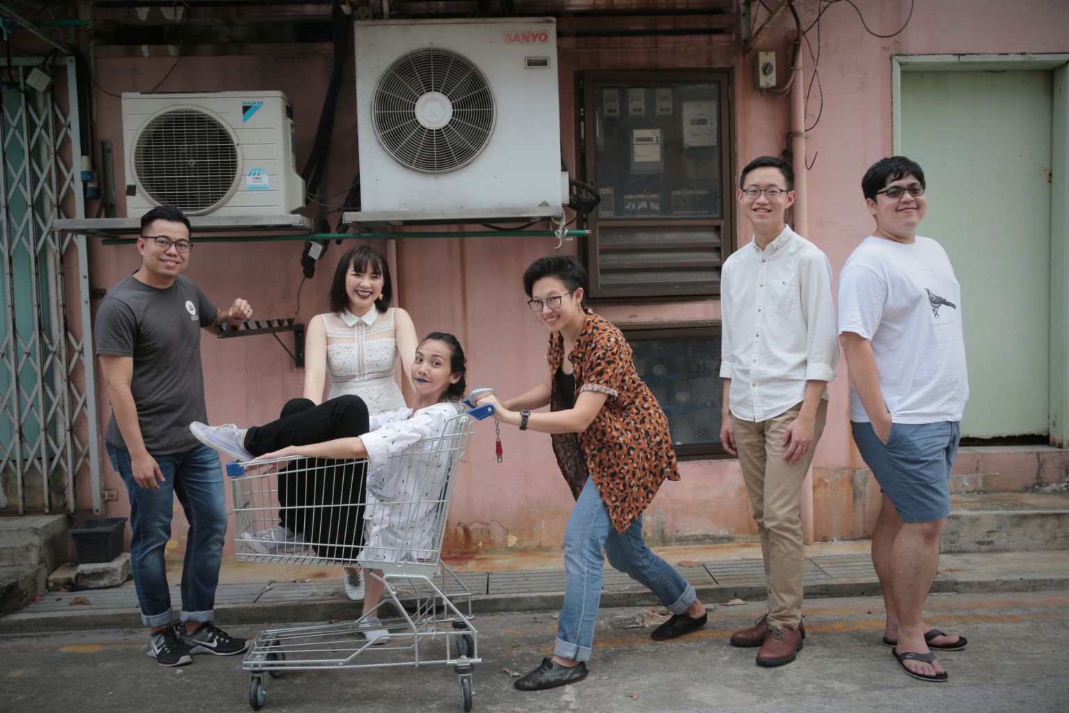 (From left) Millennial poets Rodrigo Dela Pena Jr, Natalie Wang, Jennifer Anne Champion (in trolley), Stephanie Chan, Theophilus Kwek, and Crispin Rodrigues.