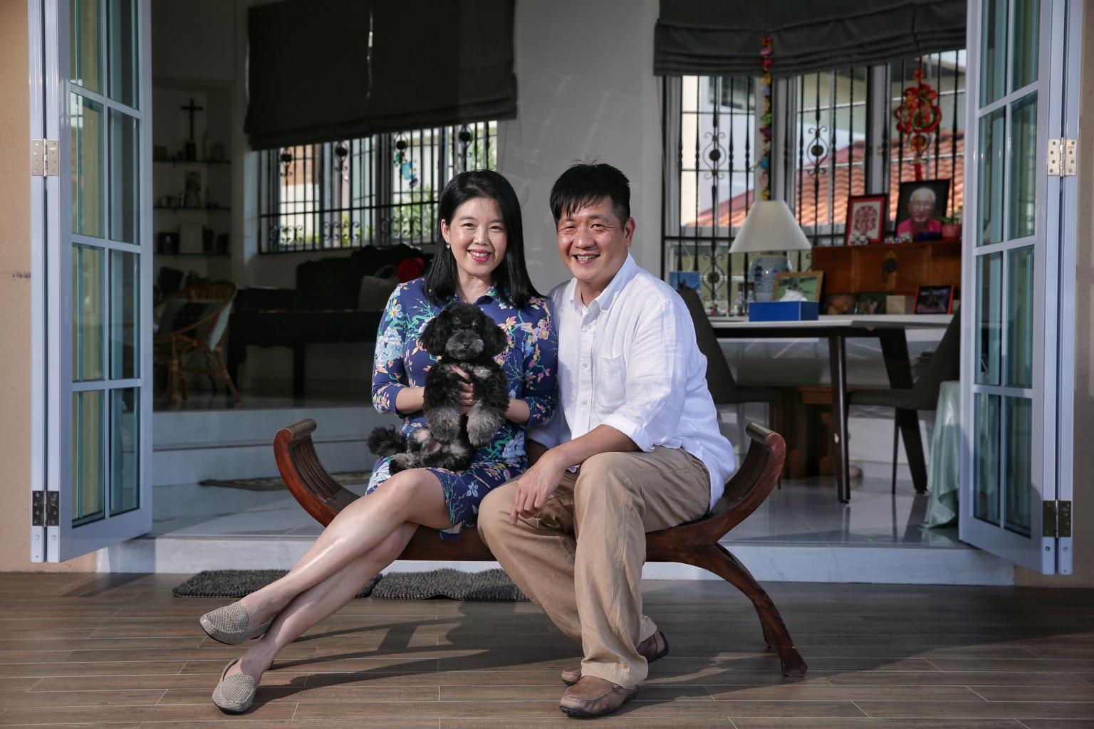 Ms Reene Ho-Phang and her husband Peter Phang with their adopted black poodle Charcoal at home on Aug 19, 2020.