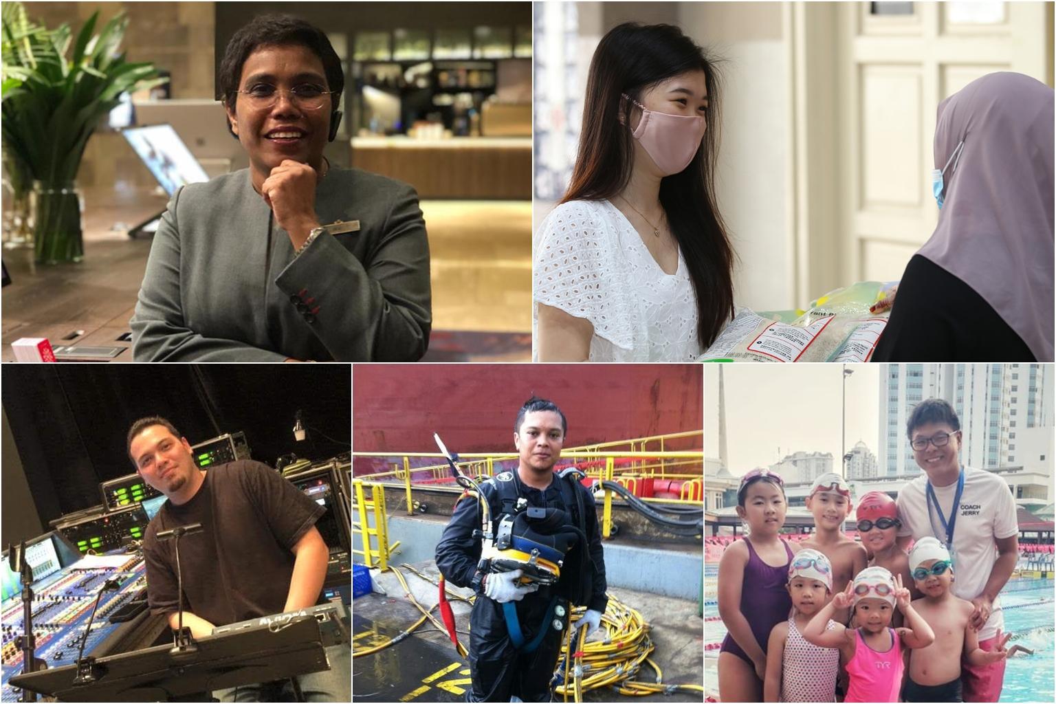 (Clockwise, from top left) Swissotel The Stamford senior duty manager Sukunah Ramasamy, Scoot cabin crew Amanda Teng, swim coach Jerry Toh, former commercial diver Nik Fauzy and audio engineer Mark Gerard Albers.