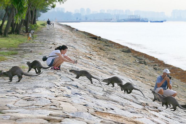 The Bishan family of otters being photographed near Marina South Pier.