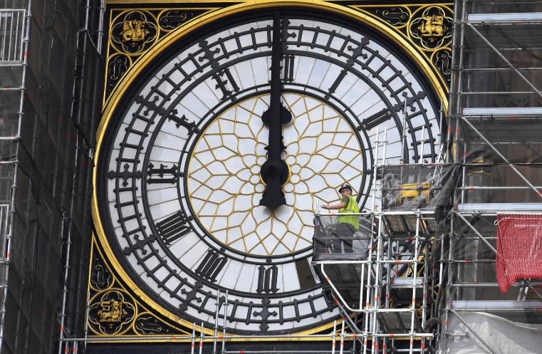 Workers replacing glass panes on the clock face of the Queen Elizabeth tower, commonly known as Big Ben at the Houses of Parliament, in London, Britain.