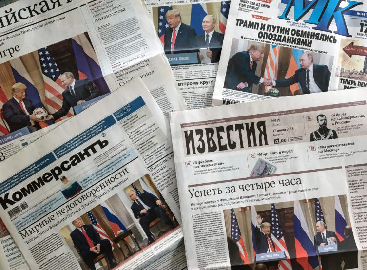 A photograph taken on July 17, 2018 in Moscow showing the front pages of Russia’s main newspapers. They feature pictures of the meeting between US President Donald Trump and Russian president Vladimir Putin in Helsinki, Finland.