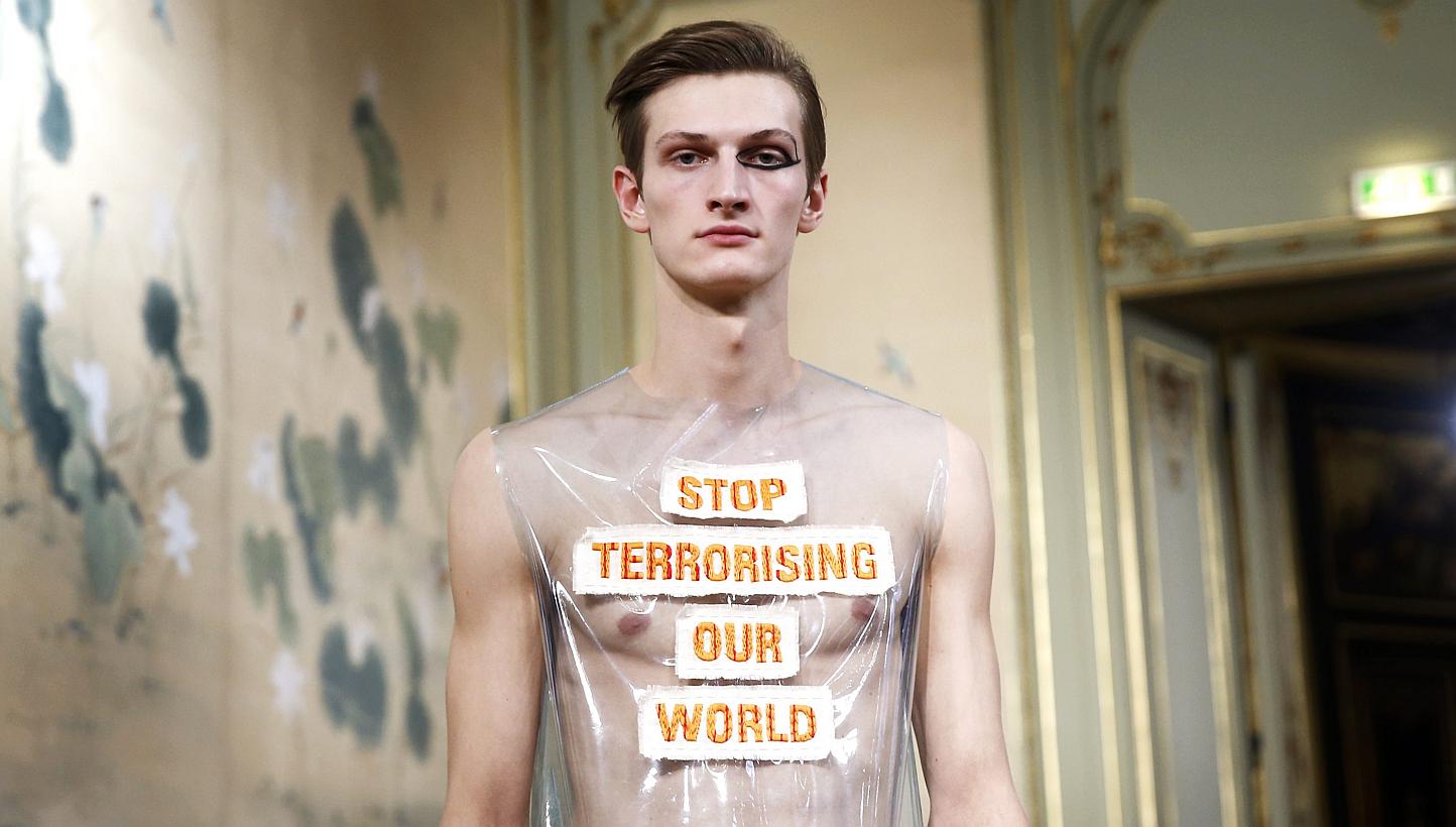After his "Stop Terrorising Our World" model, he sent others down the catwalk in an eclectically styled range that used animal sketches, Picasso-style abstracts and 3D-printed jewellery.