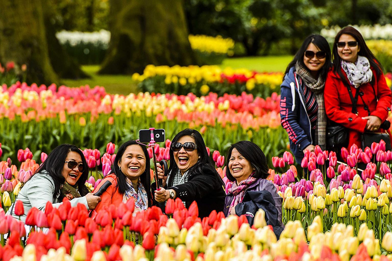 Tourists taking a photograph among flowers at the Keukenhof garden in Lisse, Netherlands, on April 28, 2016.