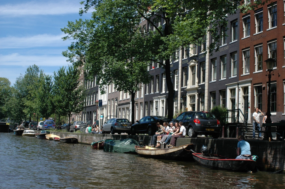 People sitting at a canal in Amsterdam, The Netherlands.