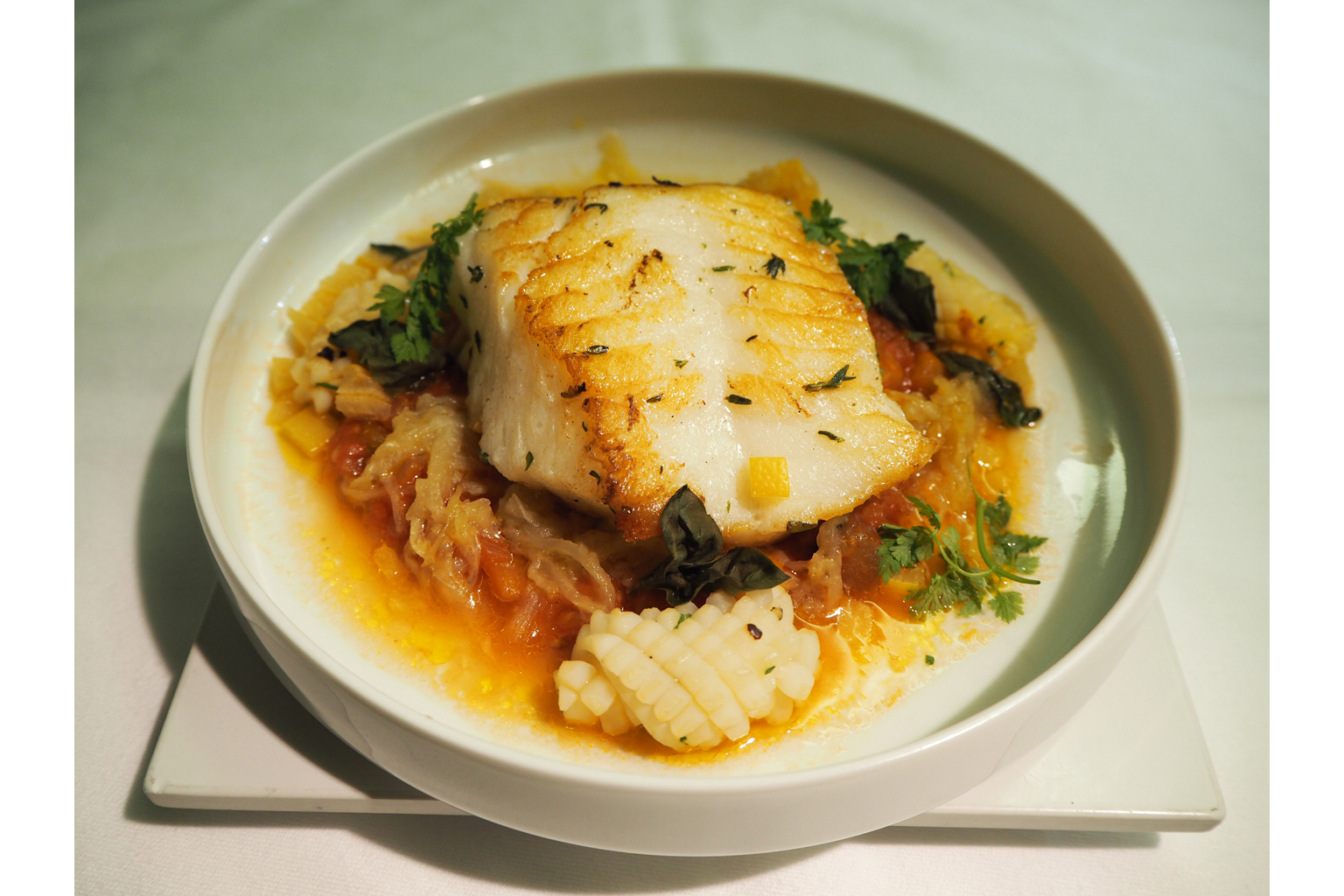Sea bass with a confit onion jam, ratatouille and squid with confit lemons is served in Business class.