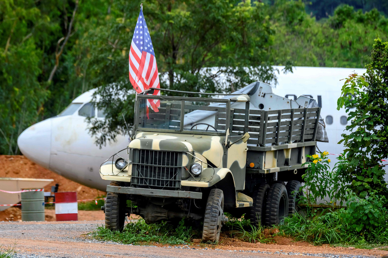 <p>This photograph taken on September 1, 2020 shows a US Army truck parked in the yard of the Coffee War complex where a retired Airbus 330 air-plane has been turned into a coffee shop at an attraction site, outside Pattaya in Chonburi province. - With millions around the world stuck at home due to the pandemic, "plane cafes" in Thailand are offering customers the chance to pretend they are in the sky -- and the idea seems to have taken off. (Photo by Mladen ANTONOV / AFP)</p>