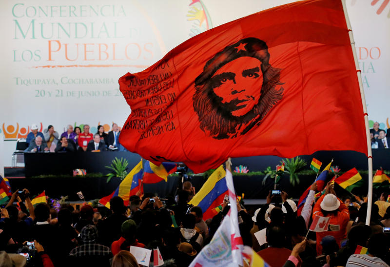 A flag carrying the image of Ernesto "Che" Guevara during the inauguration in June of the World People's Conference in Bolivia, where many still revere the revolutionary leader.