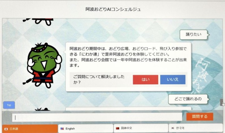 However, the call centres operate only during daytime hours on weekdays. An official of the prefectural government's general policy section said: "We hope visitors will be able to fully enjoy Awa Odori by getting information effortlessly from the AI concierge system, which operates 24 hours a day."