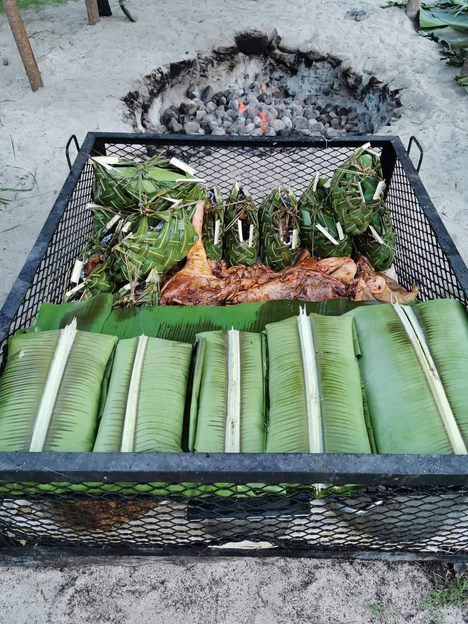 Fish, shrimp, wild pig and local fruit like breadfruit and taro are individually wrapped in banana leaves and the "oven" is covered with more banana and purau (hibiscus) leaves and layers of earth, before being cooked for hours.
