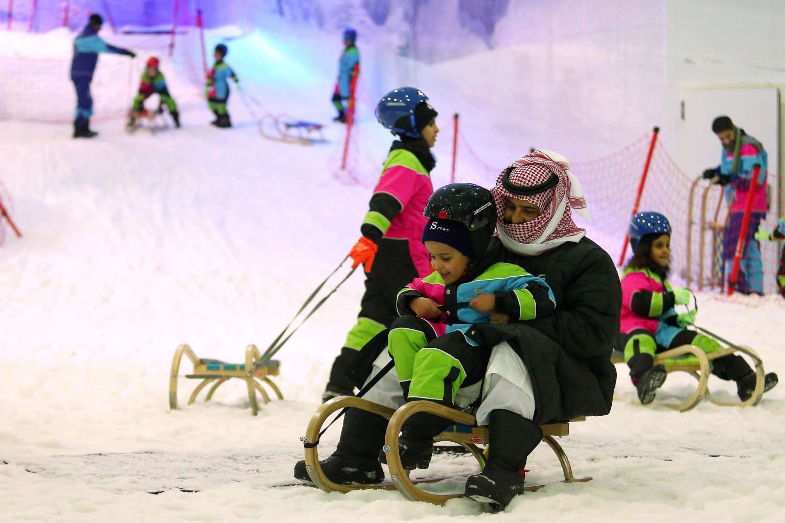 Saudi man and a boy sliding on a sledge at the indoor snow theme park 'Snow City' in the Al-Othaim Mall Rabwa in the capital Riyadh on July 20.