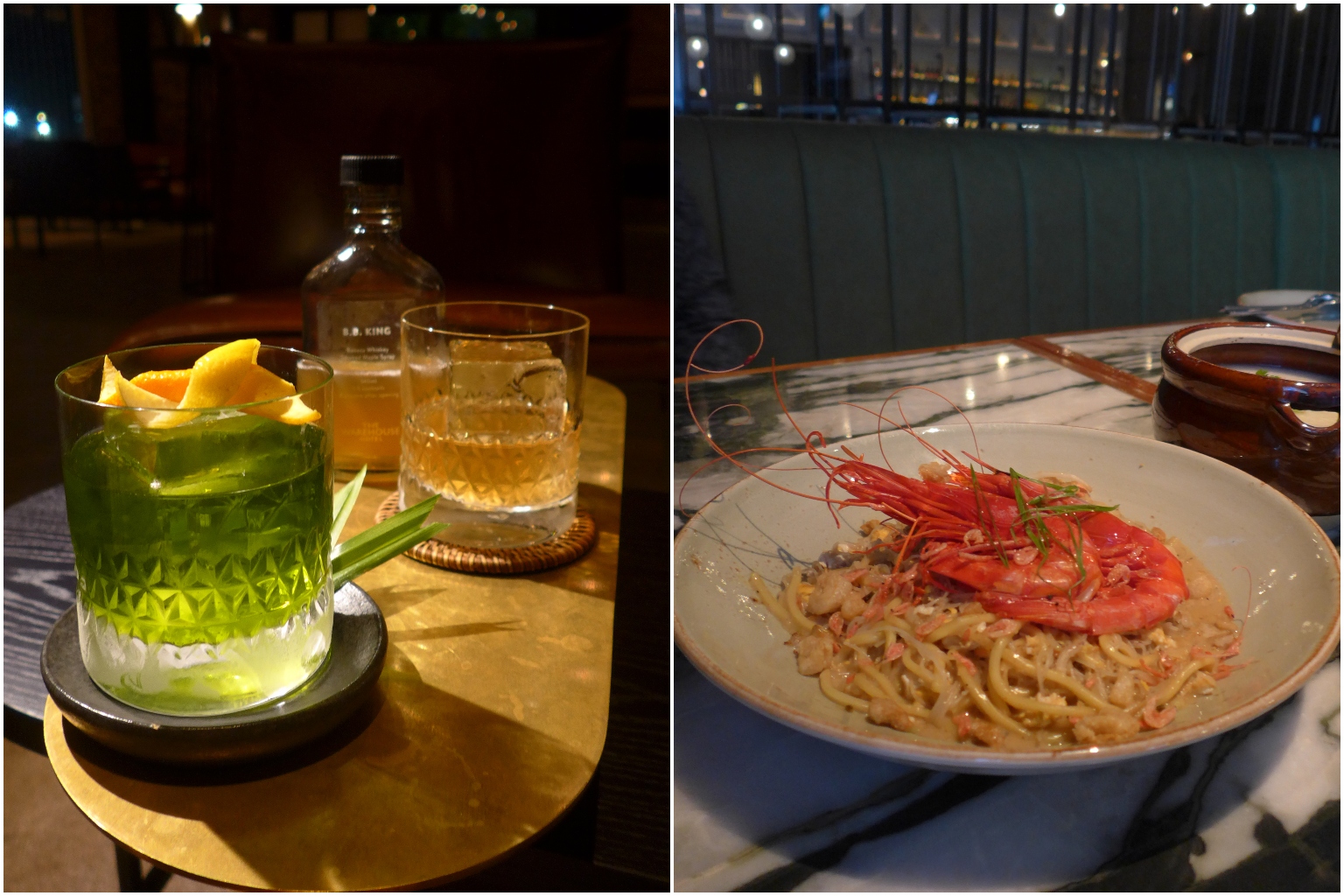 Afterwards, I grab a drink on the house at the lobby bar beneath the godown-style pulleys, from which now hang globes of soft light.