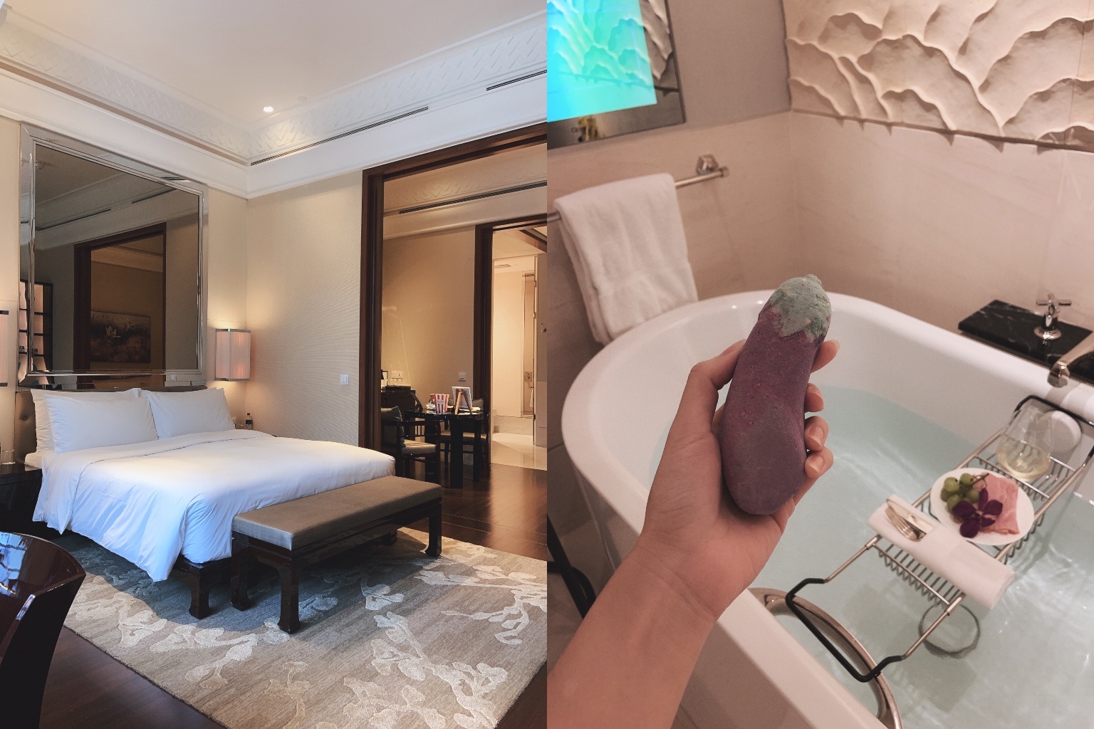 The Capitol Kempinski Hotel Singapore's Stamford Suite includes a bedroom (left) and a bathroom (right) with a mammoth bathtub.