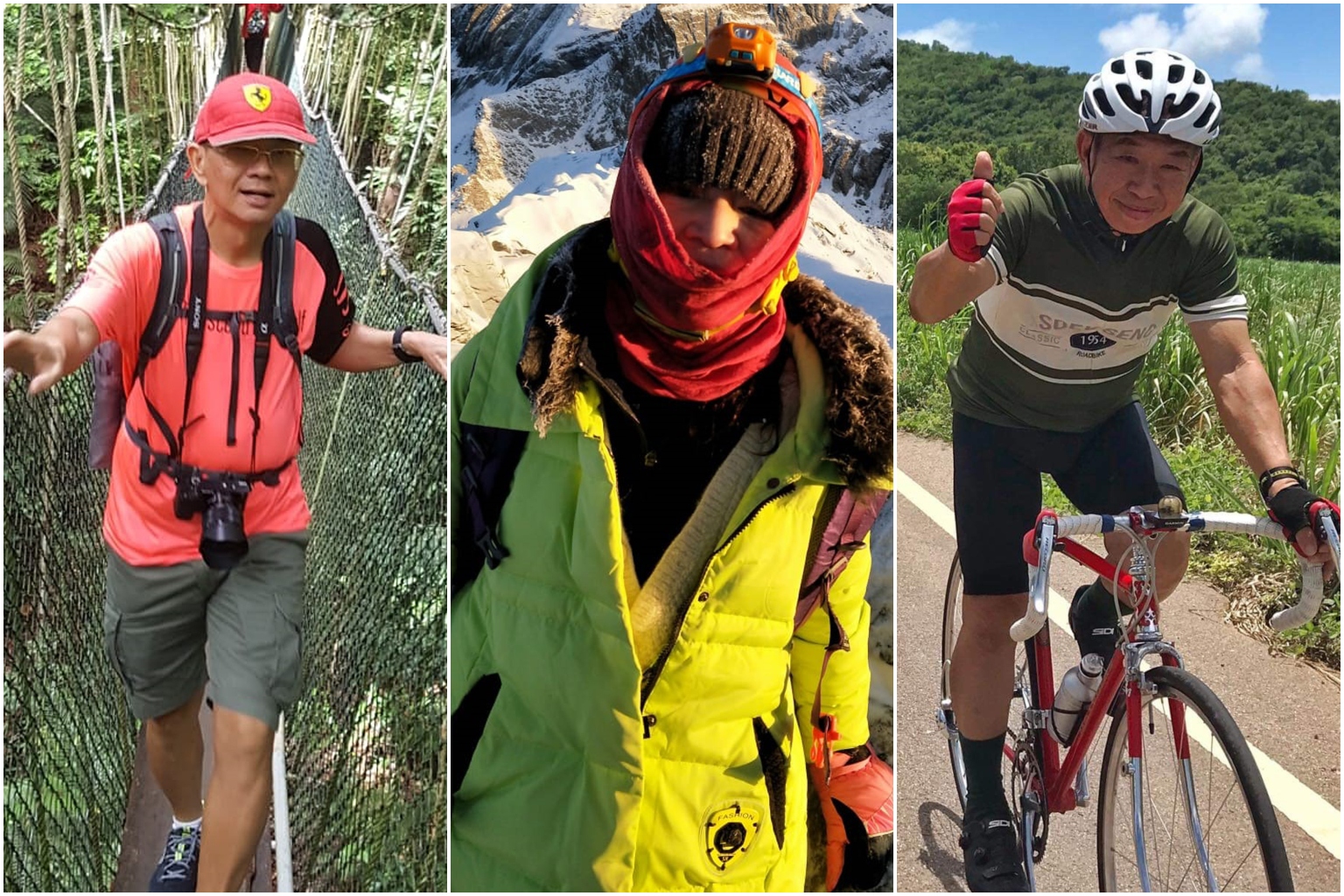 (From left) Lim Tiong Jee, 71, in Taman Negara national park in Malaysia, Irene Yeow, 66, at Mount Siguniang in Sichuan, and Poon Kng Joo, 63, riding over 100 km in Thailand to the border with Myanmar.