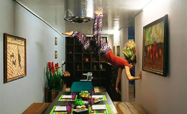 The reading room of Upsidow, an upside-down house located in an old abandoned quarry.