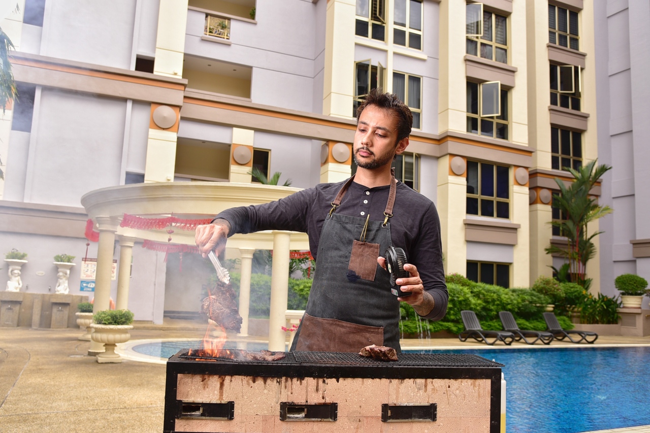 Most of his bookings have been in landed properties and condominiums where he is allowed an open fire. He even prepares tent options as wet-weather contingency, after learning his lesson from a surprise downpour during one dinner.
