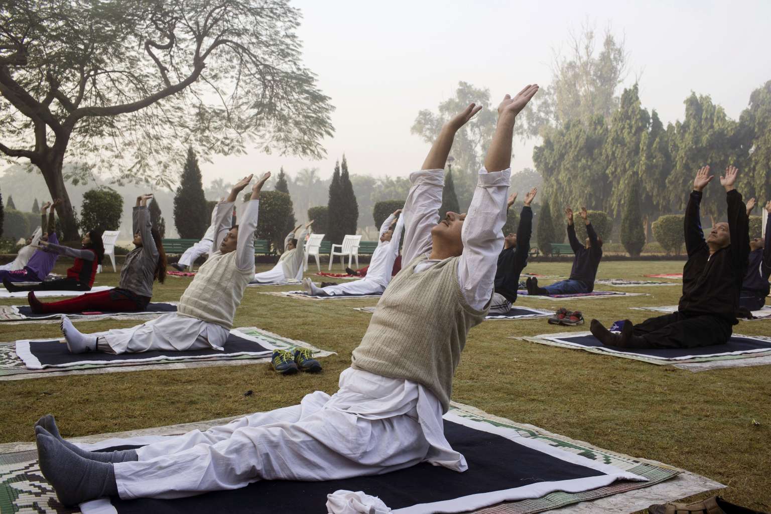 People stretch while performing a yoga pose at Nehru Park in New Delhi, India, on Nov. 20, 2016.
