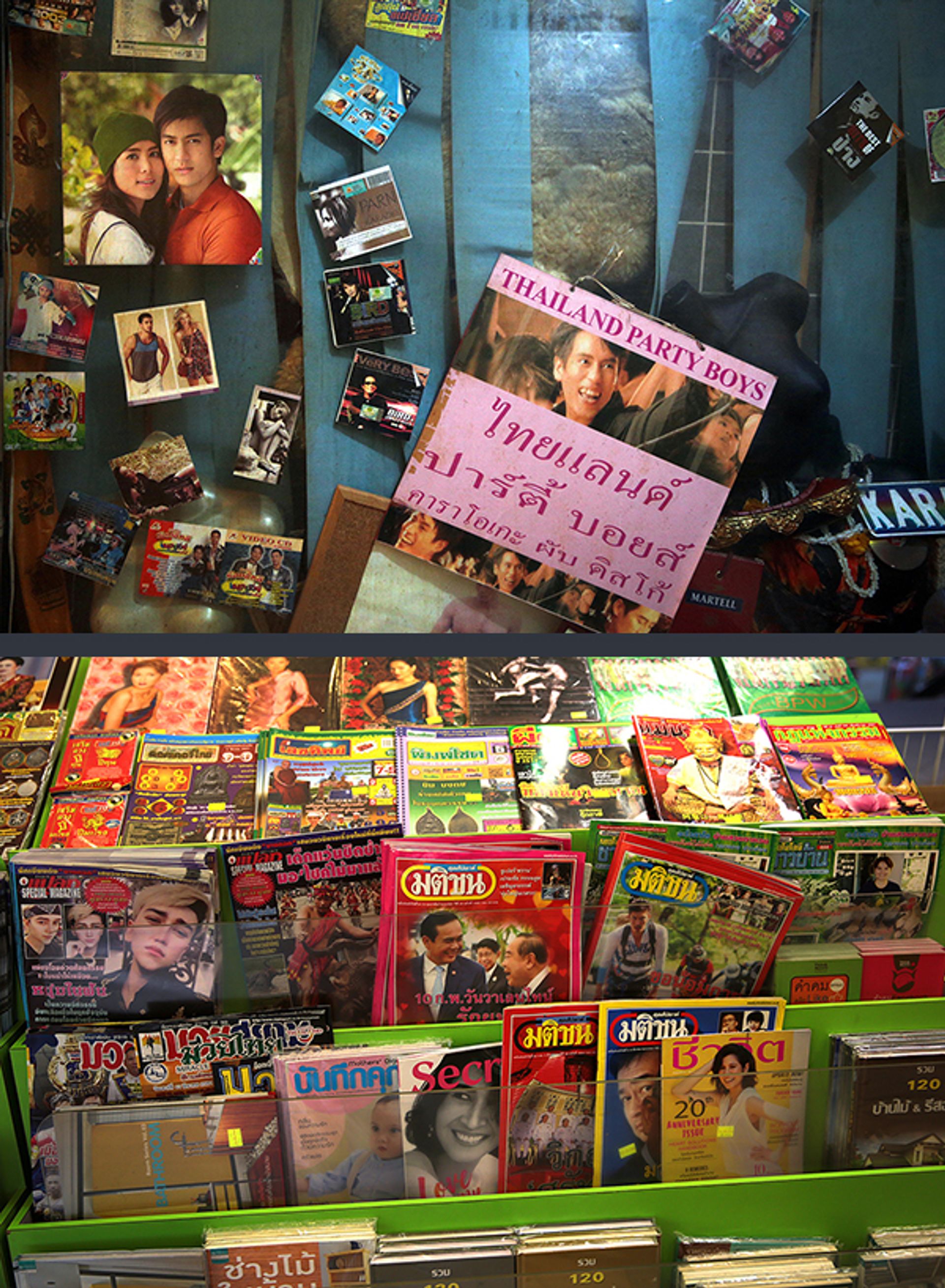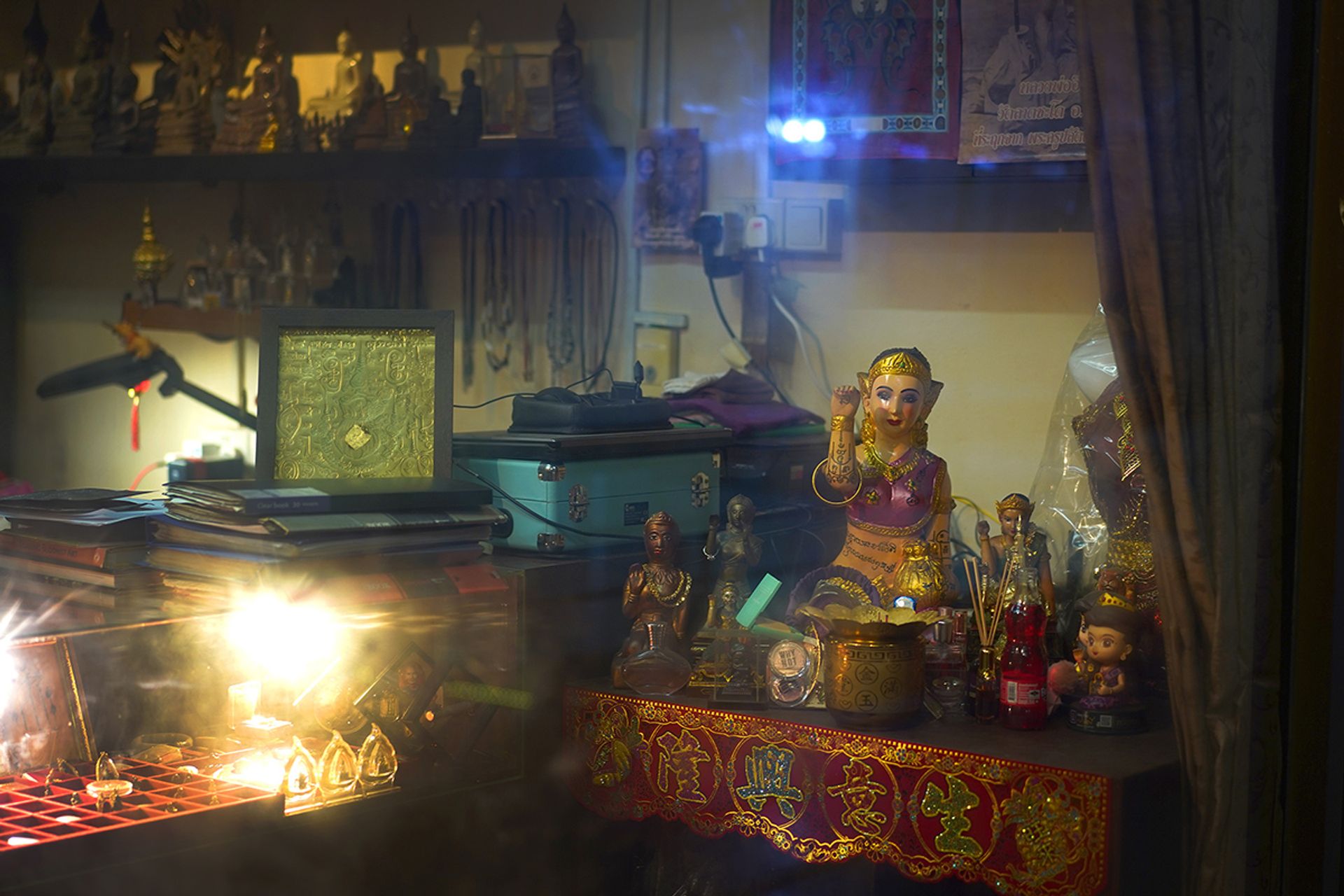 A 2022 photograph of a shop selling Thai Buddhist artefacts and amulets, some of which could purportedly increase the user’s luck in areas such as romance or wealth.