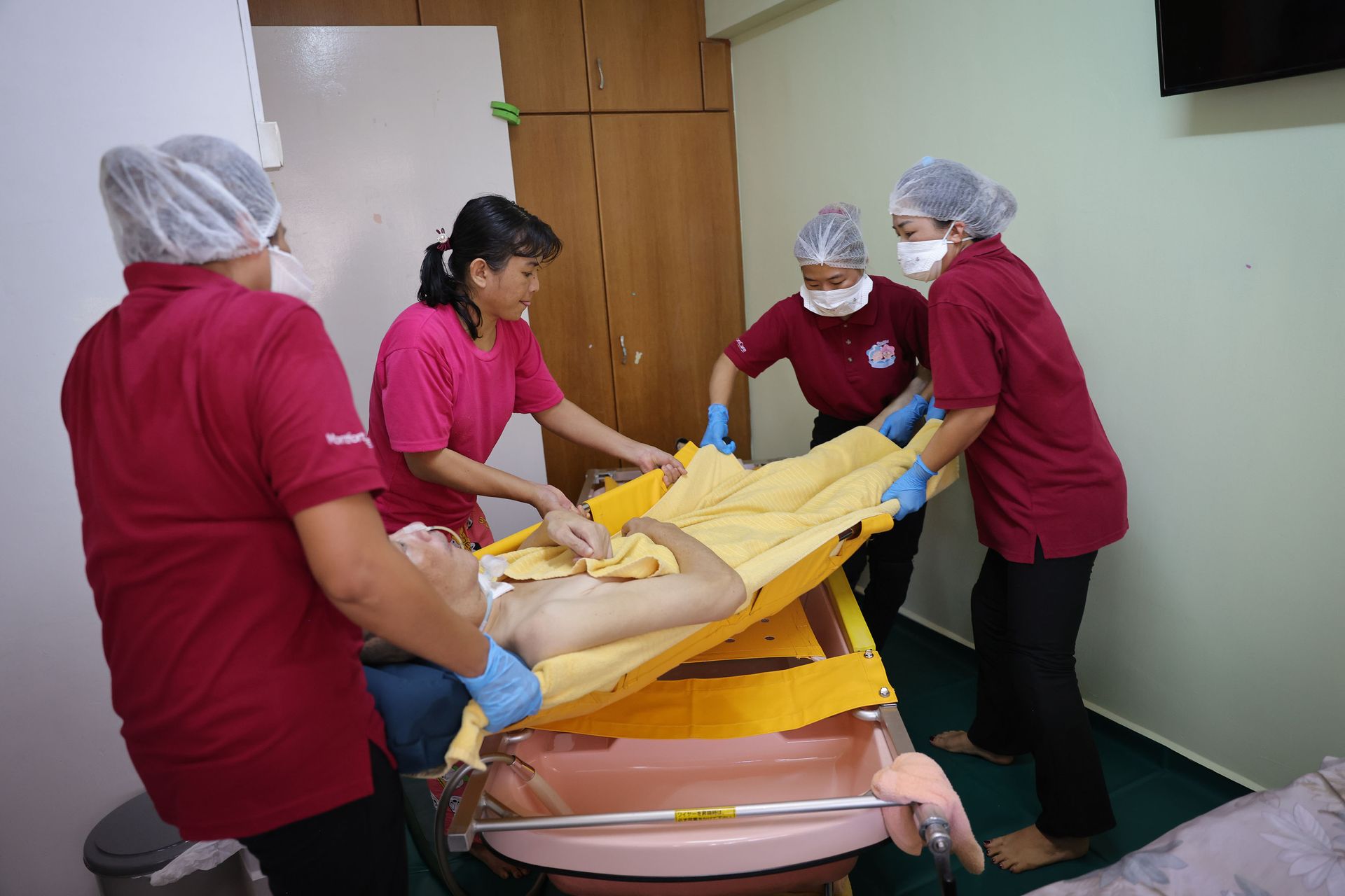 Ms Moe Sapal and Ms Charophina bathe Mr Lee. Ms Khaing Mar Lwin gives cues, such as when Mr Lee needs to be shifted. She also ensures that his head is always a safe distance from the water.