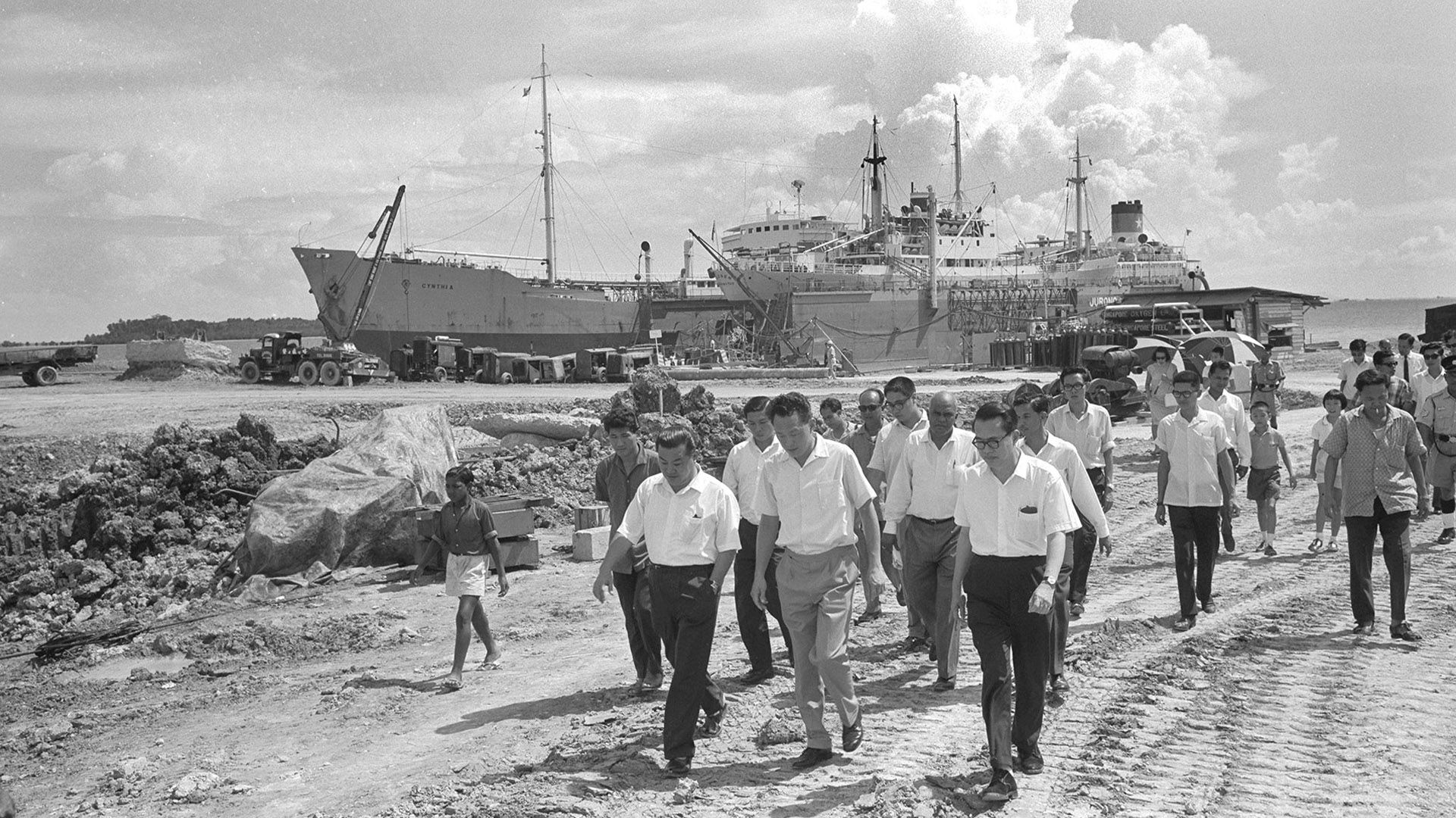 Mr Lee (centre) at Jurong port in May 1965, with Economic Development Board chairman Hon Sui Sen (right, in glasses). Jurong’s deep coastal waters made it suitable for a port, which became operational that year.