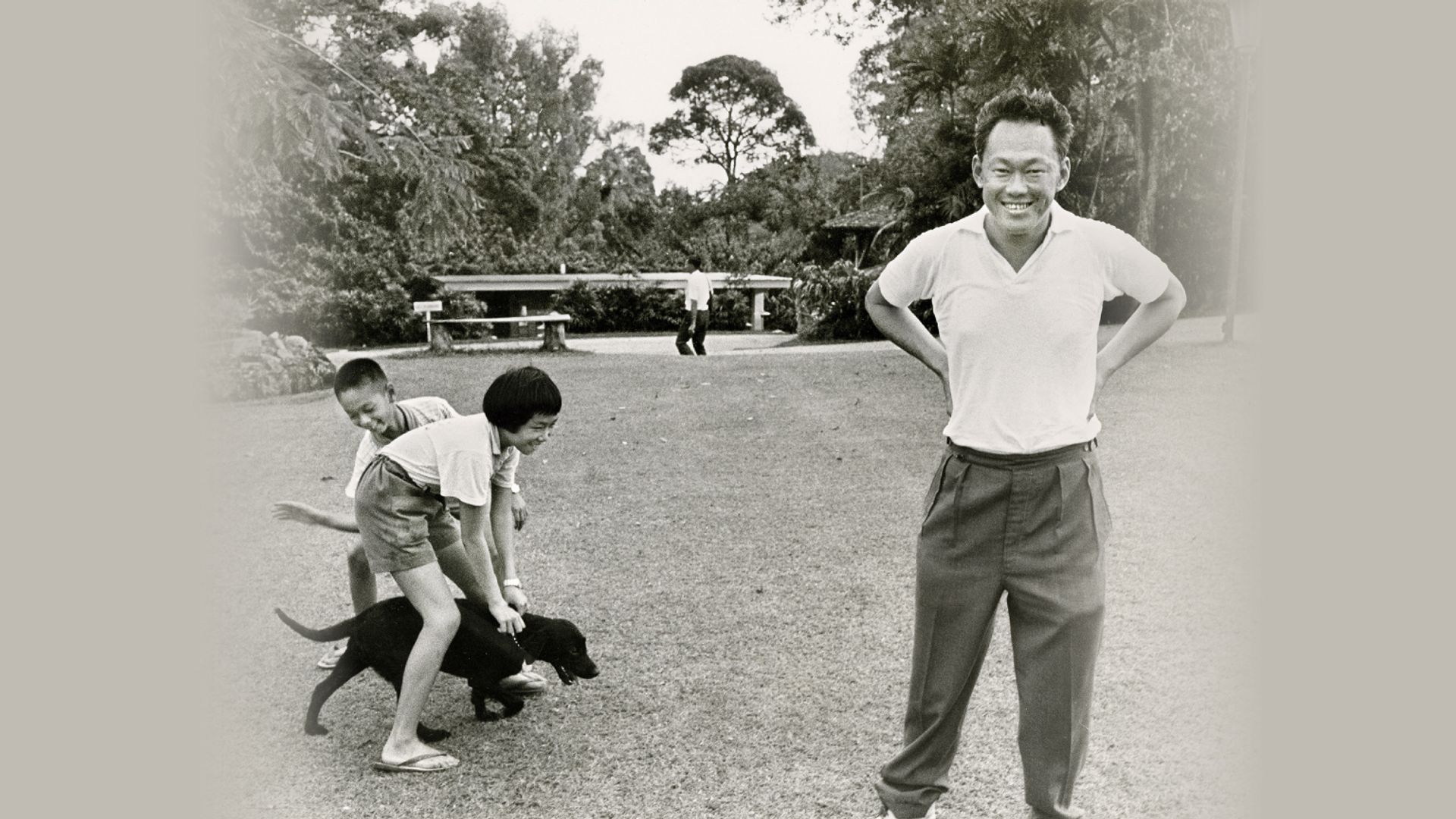 Mr Lee taking a break at the Istana while Hsien Yang (left) and Wei Ling play with their pet labrador Niki on the front lawn of Sri Temasek. Mr Lee spent an hour or so every evening with his children at the Istana before having dinner together at their Oxley Road home. Then, he would resume his work at home. Source: Lee Kuan Yew