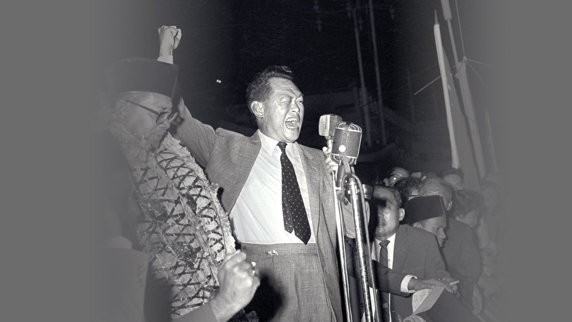 Mr Lee leading a cheer for Malayan Prime Minister Tunku Abdul Rahman, who was going to London to discuss merger between Singapore and Malaya, in November 1961.